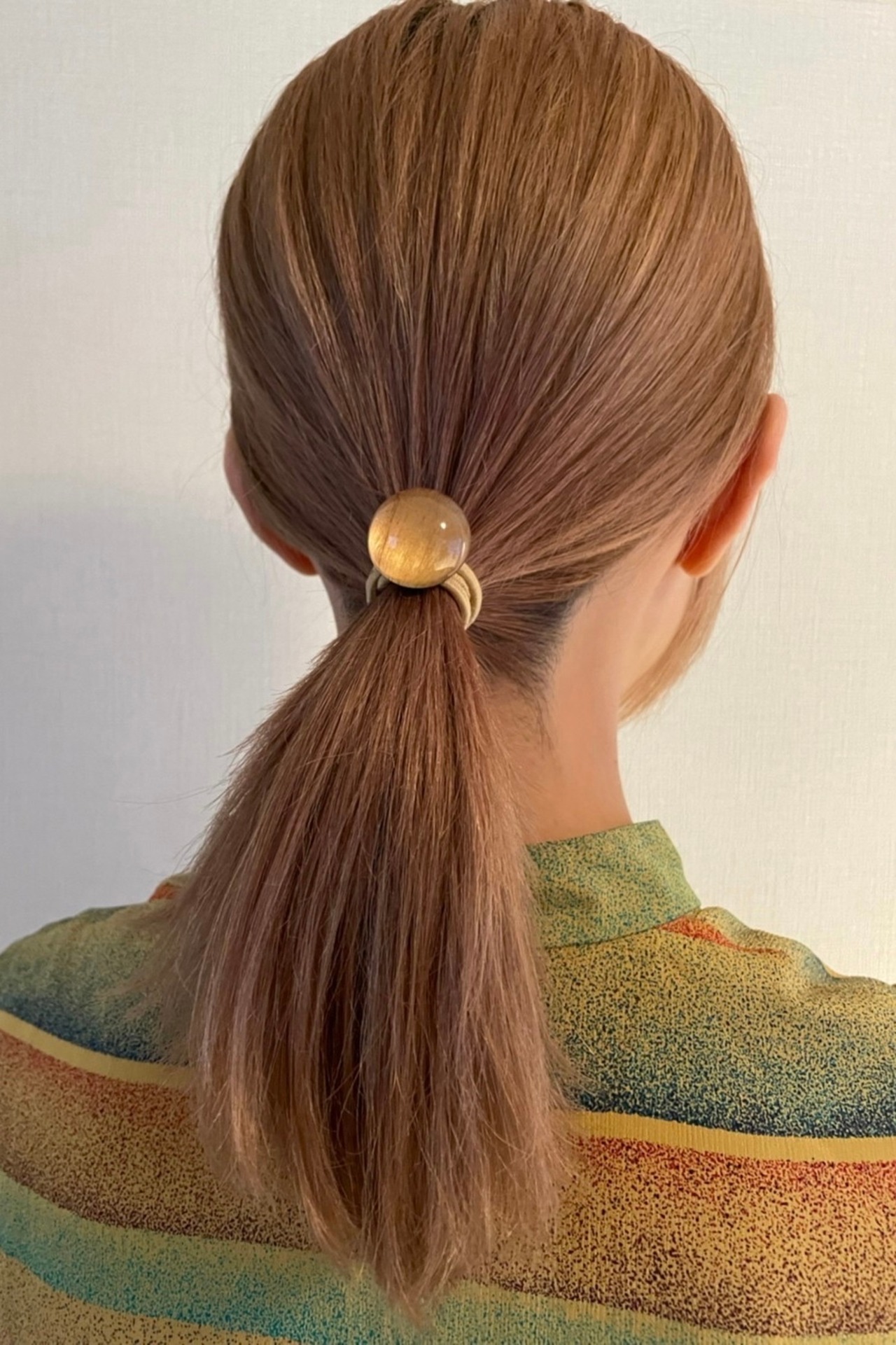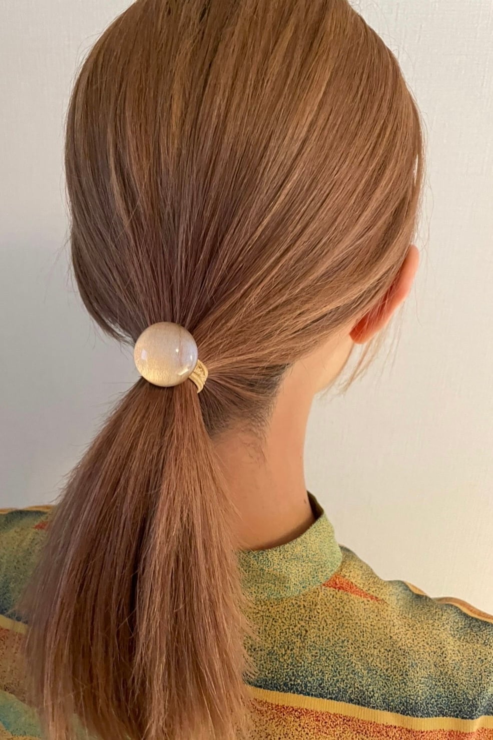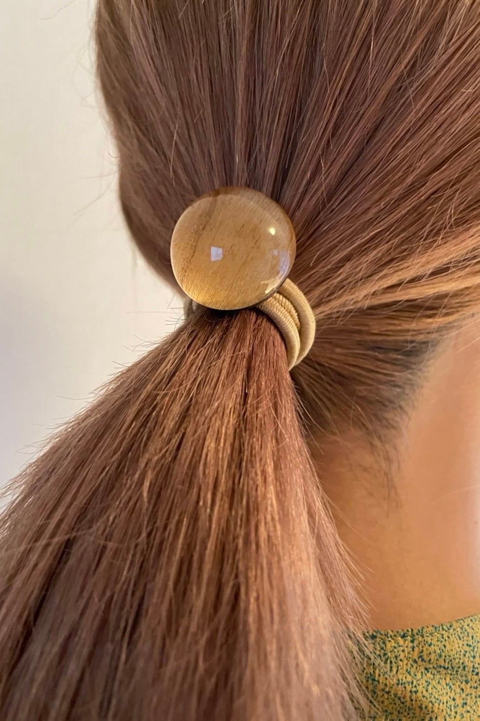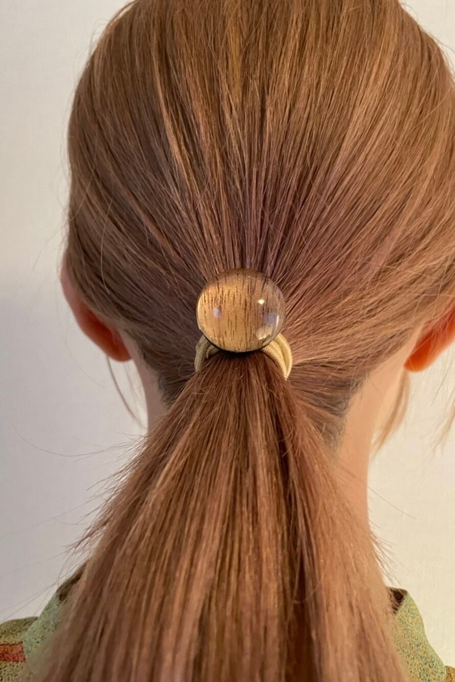 木とガラスを合わせたヘアゴム、ぷっくりした形がかわいいシンプルなデザインです。
